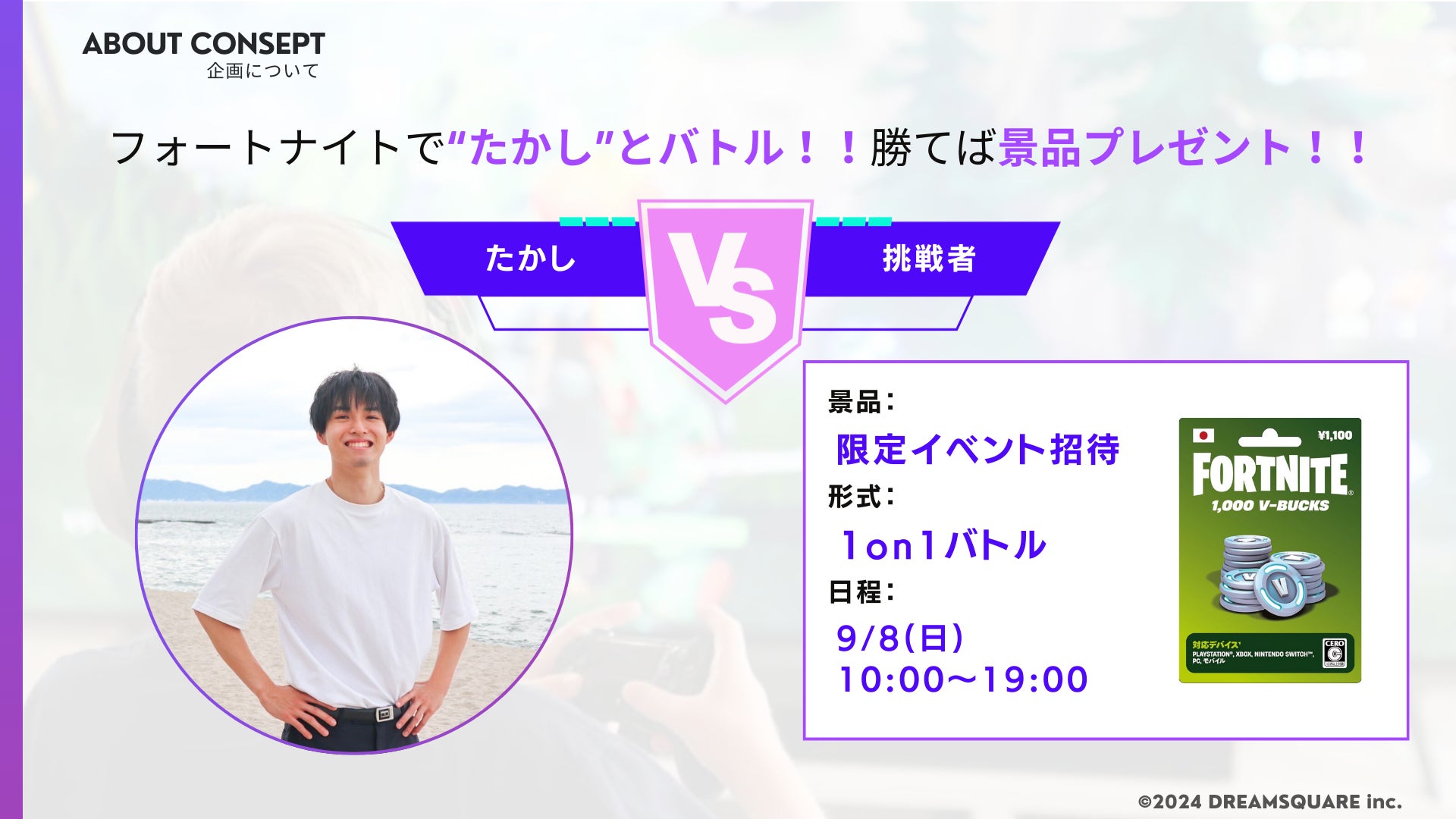 日本最大規模の学生ビジネスコンテスト「YUME PRO学生ピッチ甲子園」による学生起業家支援の一環として、会場はYUME PRO2025実行委員会の丸の内線銀座駅地下改札前 YUME PRO特設ブースを提供していただきました。DREAMSQUARE 代表取締役 の”たかし”とFortniteの1on1で勝利すると、優勝賞金 V-bucks総額3万円の限定イベント招待券 をもらえます!