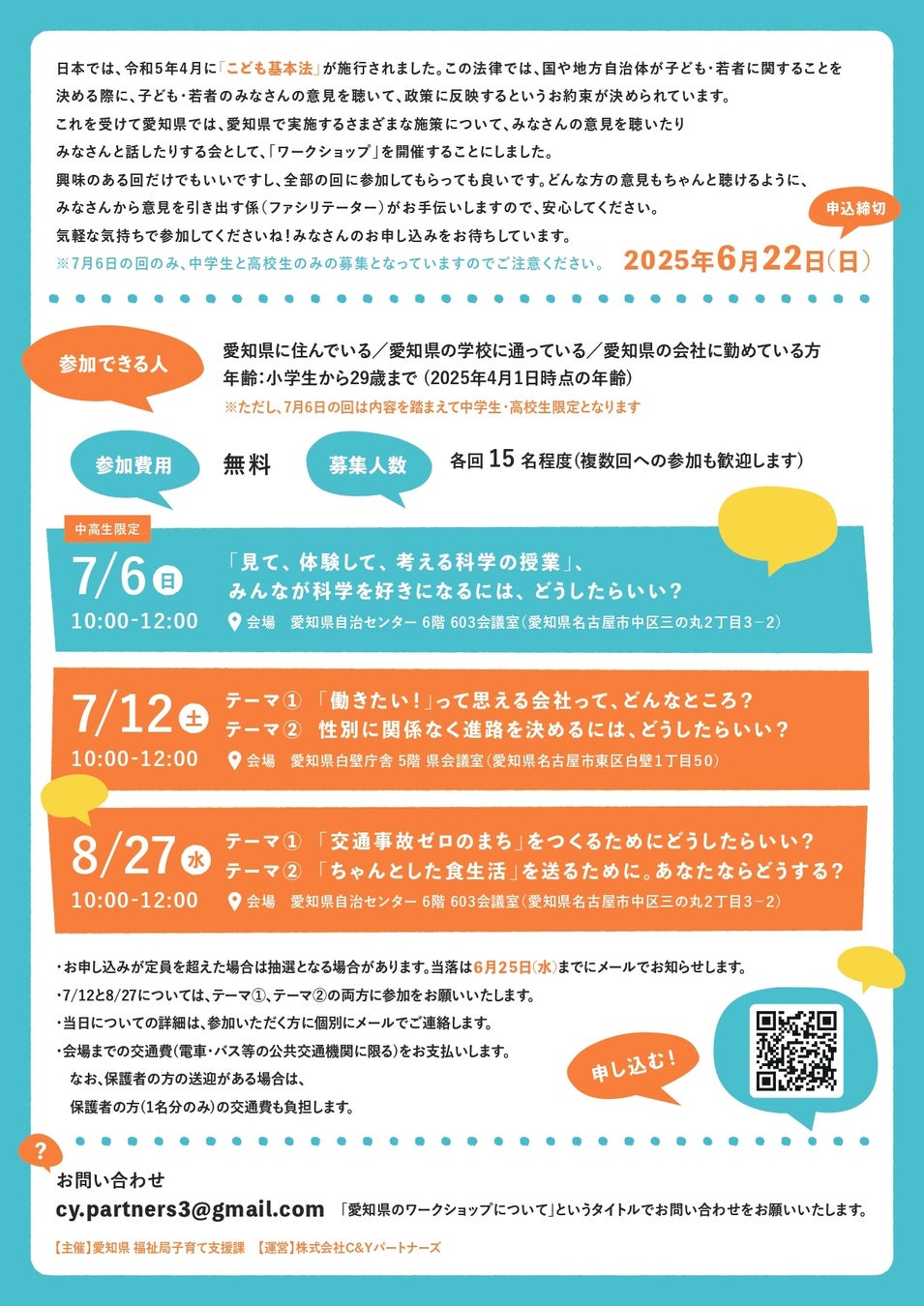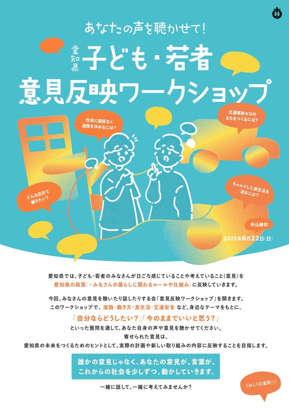 具体的には、こども・若者を集めたワークショップを開催し、県の施策に対して意見を聴き、愛知県の施策に子ども・若者の声を反映する取り組みを推進していきます。