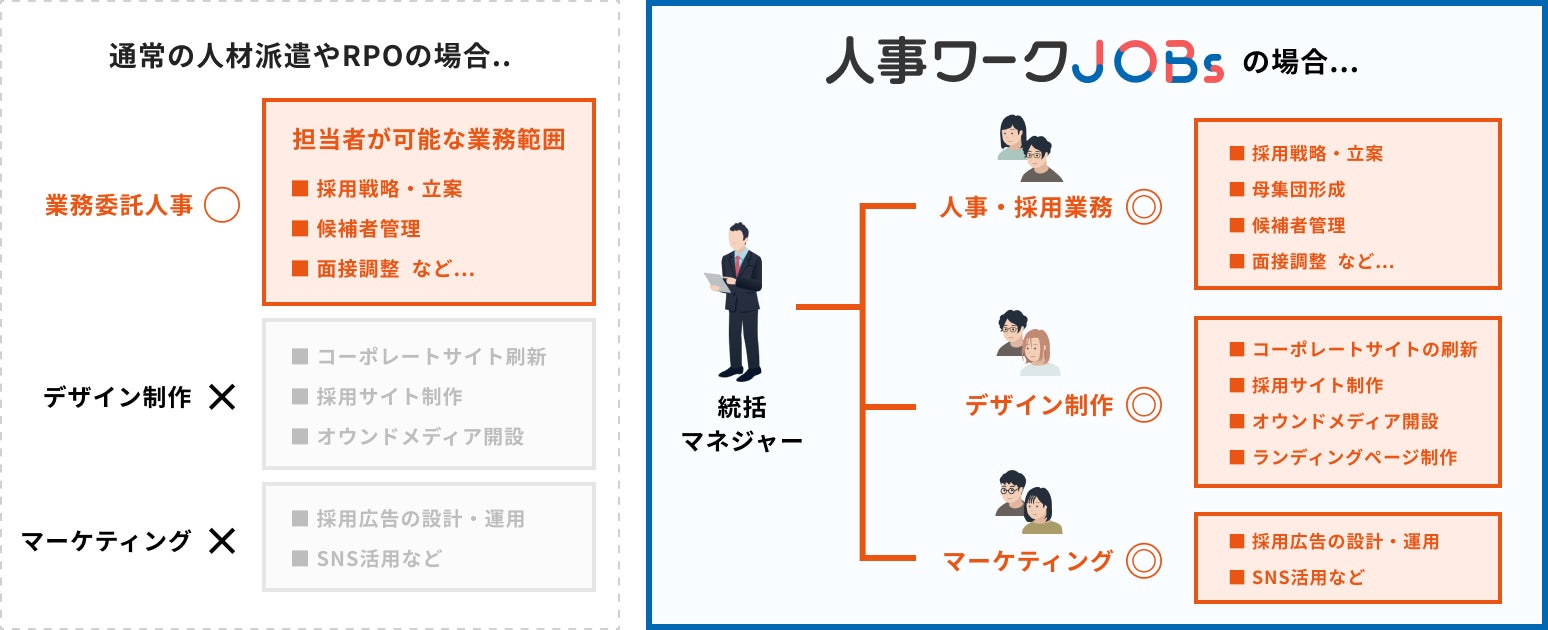 「人事ワークJOBs」では、採用活動目線でのクリエイティブに特化したデザイナーやマーケター人材をパートナーとして迎え、より包括的に企業の採用ブランディングを支援する体制を整えることで、従来の人事業務に加えた市場ニーズに応えられるようにいたしました。