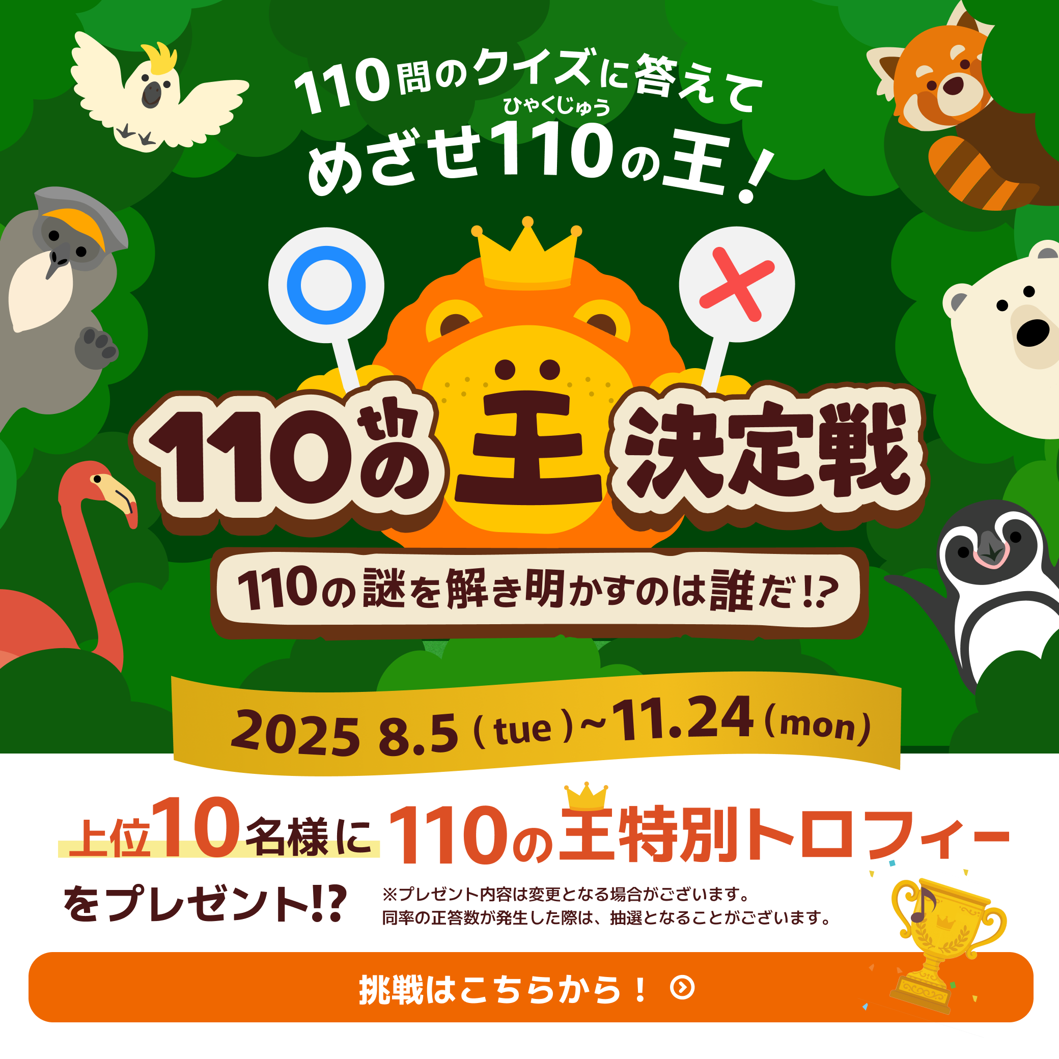 参加者は園内にちりばめられた6ヶ所のヒントを手がかりに、WEB上で全110問の○×クイズに挑戦。上位10名(同率の場合、抽選)には、“110の王”の称号と、特製トロフィーが授与されます。