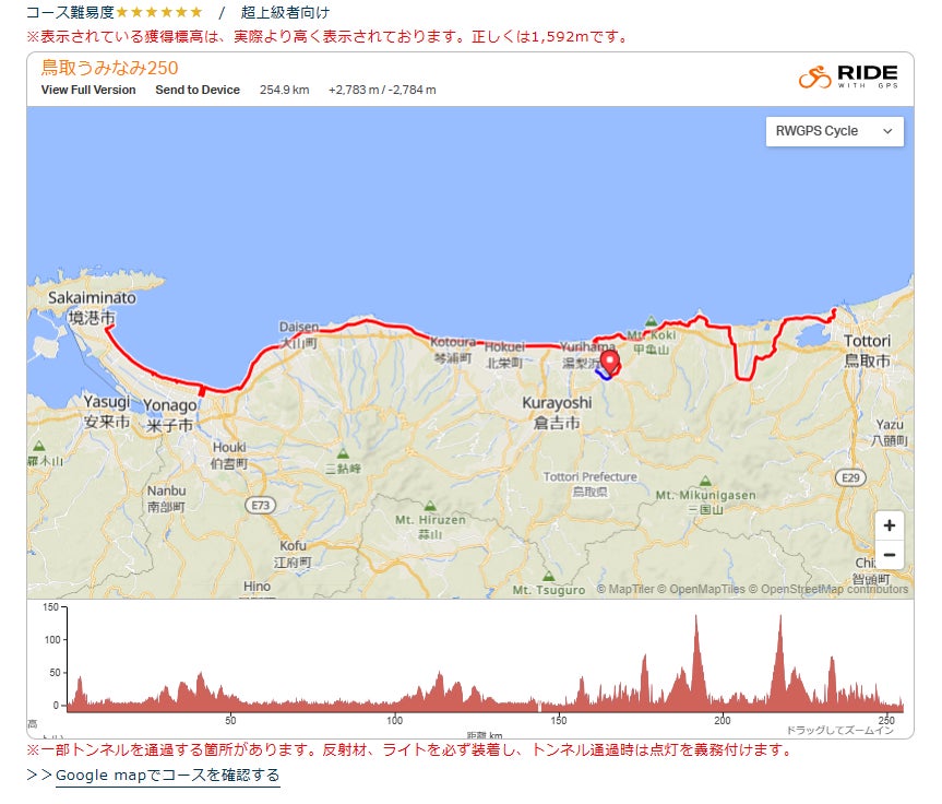 鳥取県中部の「中国庭園 燕趙園」をスタートして西部方面に向かい、境港市で折り返して東部に向けて一気に駆け抜け、鳥取港(賀露)を再度折り返し。再び中部の「中国庭園 燕趙園」まで戻るルートになります。全国屈指の全長だけでなく、コース後半ではアップダウンの激しい箇所もあるため、超上級者向けルートです。