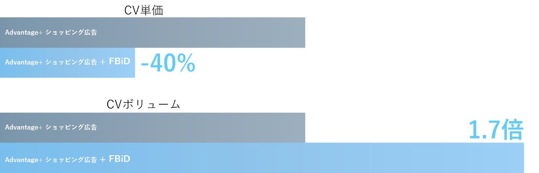 弊社の顧客がCV広告を用いてA/Bテストで検証したところ、FBiDの導入により、ASC単体と比較して、CV単価が40%減少し、CVボリュームが1.7倍になりました。