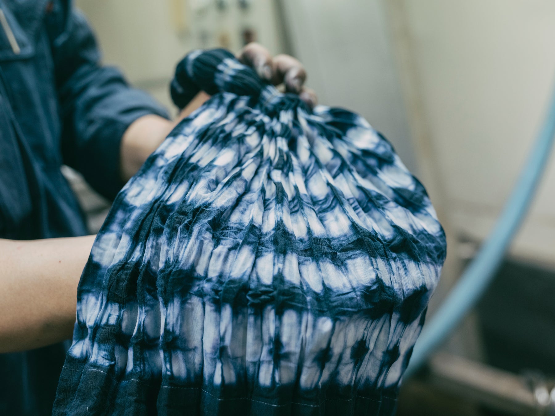 今回は、有松絞りという伝統の技を支えながら時代ごとに新たな表現に挑戦を続ける、大正元年の創業から五代続く久野染工場との協業。