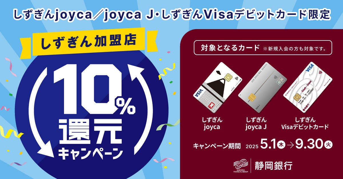 株式会社静岡銀行は、キャッシュレス事業のさらなる拡大と、当行取引先の「しずぎん加盟店」への送客によるエリア経済ネットワーク構築を目的に、2025年9月30日(火)までの期間中、当行が発行するクレジットカードおよびデビットカードをご利用いただいたお客さまを対象とした「しずぎん加盟店10%還元キャンペーン」を実施します。