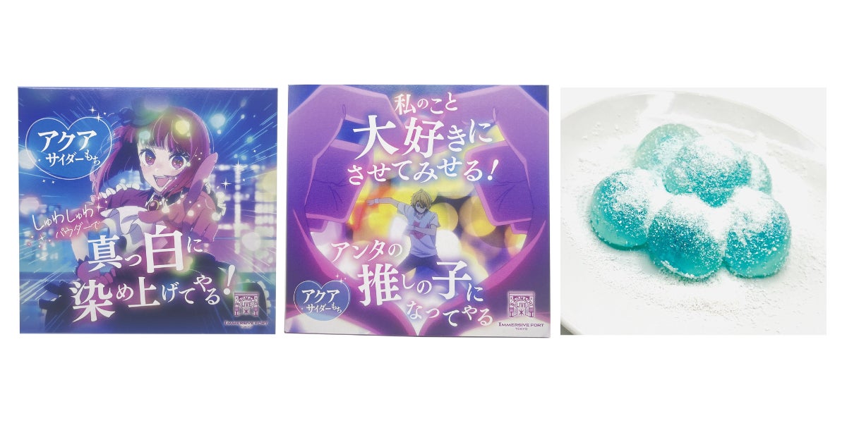 アクアをイメージしたブルーのサイダーもち。「重曹」入りの白いしゅわしゅわパウダーをかけて、「真っ白に染め上げて」弾ける食感を楽しもう!