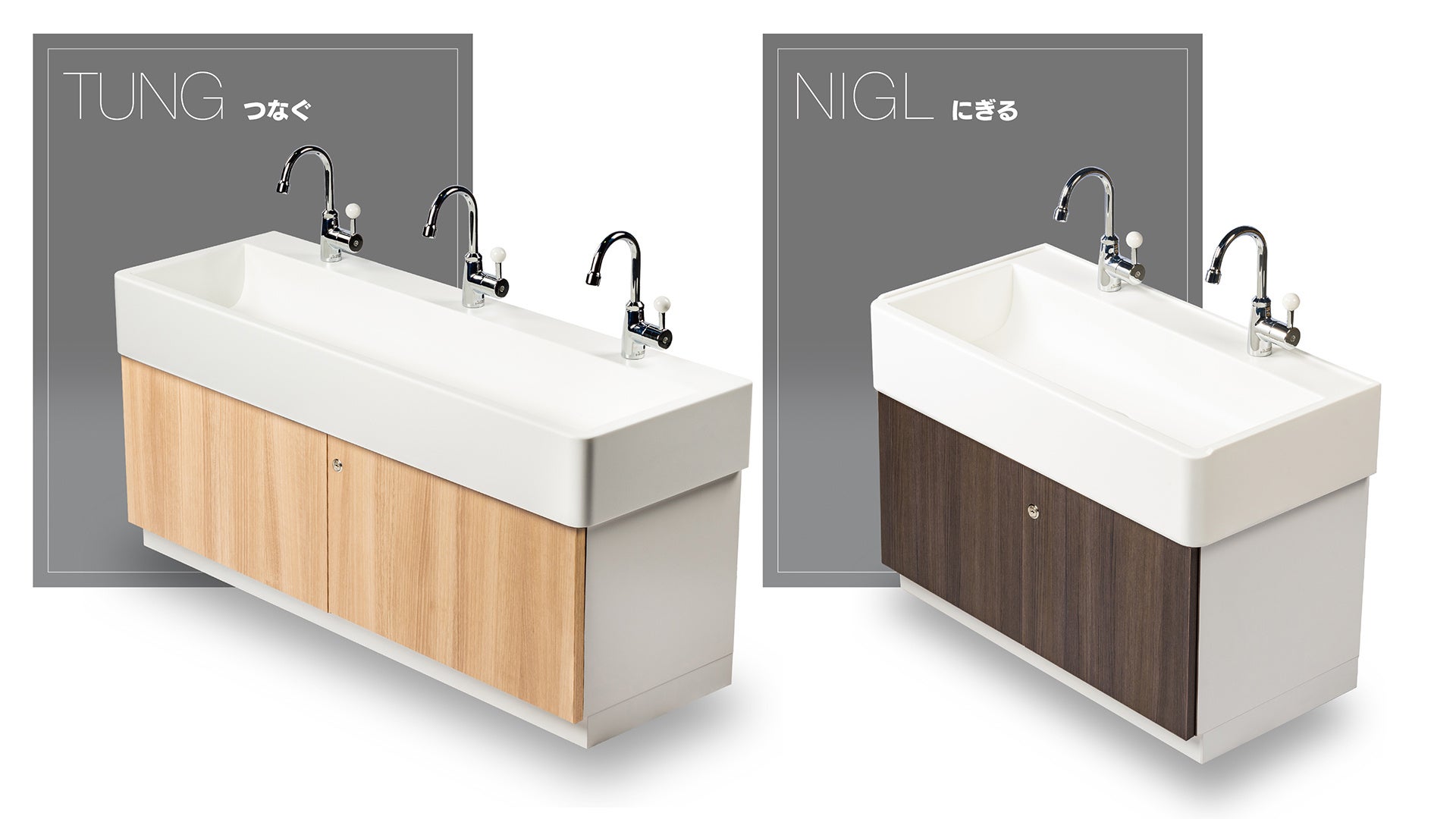 tetoteは、1~3人用手洗いカウンターシリーズの【TUNG つなぐ】【NIGL にぎる】と、こどもたちの興味を引くかわいいデザインシリーズ【EGAK えがく】を中心に展開しています。こどもの成長に合わせてお使いいただけるように、高さのバリエーションも用意しています。