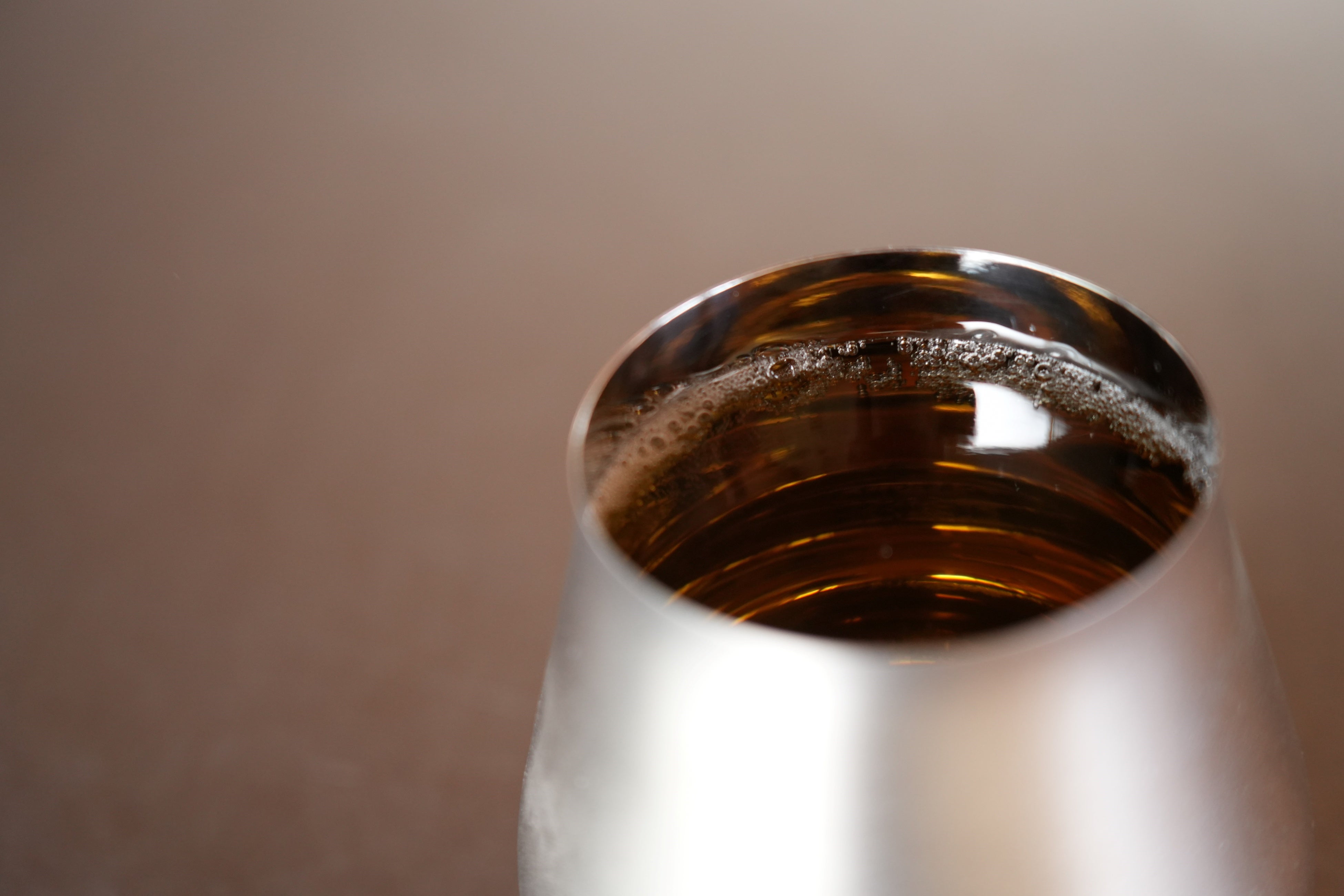 ワイングラスやウイスキーのテイスティンググラスの考え方を取り入れ、底部は丸みのある形状に。口元にかけて径を絞ることで香りを閉じ込め、繊細なウイスキーのアロマを堪能。