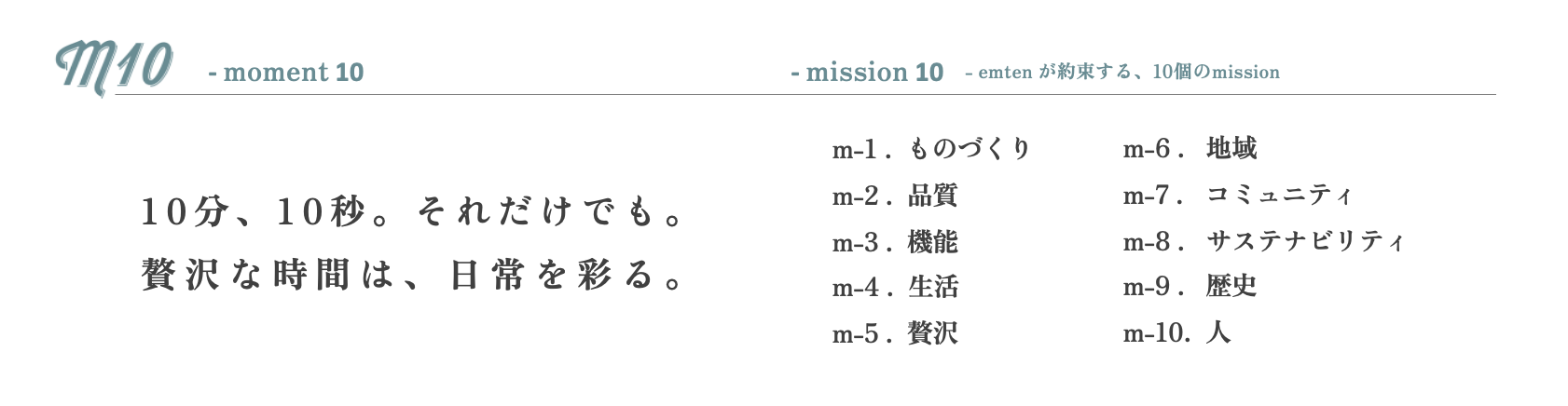 カネミツでは、2023年より新規事業プロジェクトを立ち上げ、自社技術を活用した一般消費者向けの新製品開発を行ってまいりました。そしてこの度、新ブランド「m10(エムテン)」をローンチしました。日常を彩り、人を豊かにする。豊かな瞬間を増やし、幸せの輪を広げる。そんな世界観を目指し、ものづくりと真摯に向き合い、カネミツならではの価値提供を目指してまいります。
