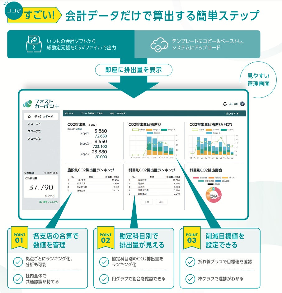 ファストカーボンは、会計帳簿のデータをもとに、国際規格に則ったCO2排出量を簡単な操作で可視化することを可能にした、中小企業向けのクラウドシステムです。