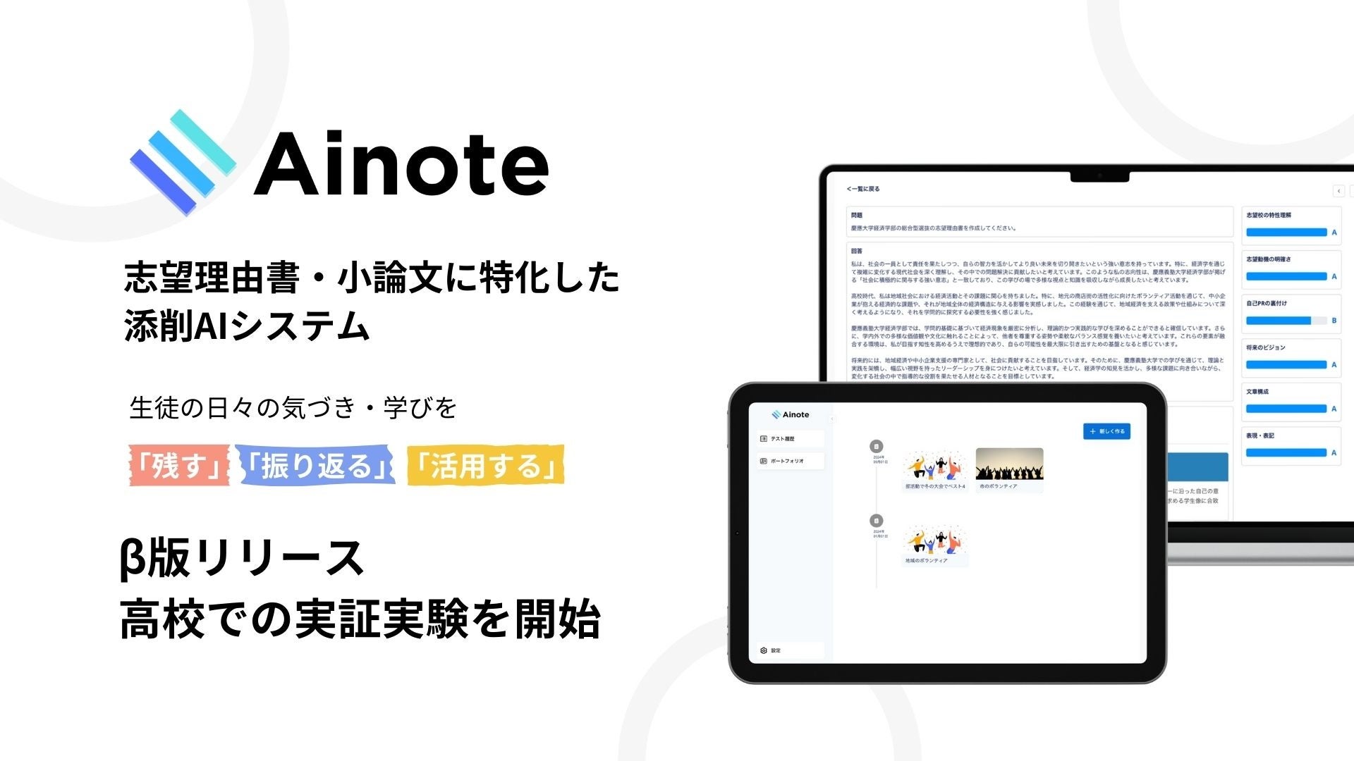 まずはAinoteの開発に際してご協力いただきました学校の教職員の皆様、生徒様そして有識者の皆様ありがとうございました。私たちのミッションである「まだみたことない、新しい選択肢を」与え続けられる存在でいられるように精進して参りますので今後ともよろしくお願いいたします。