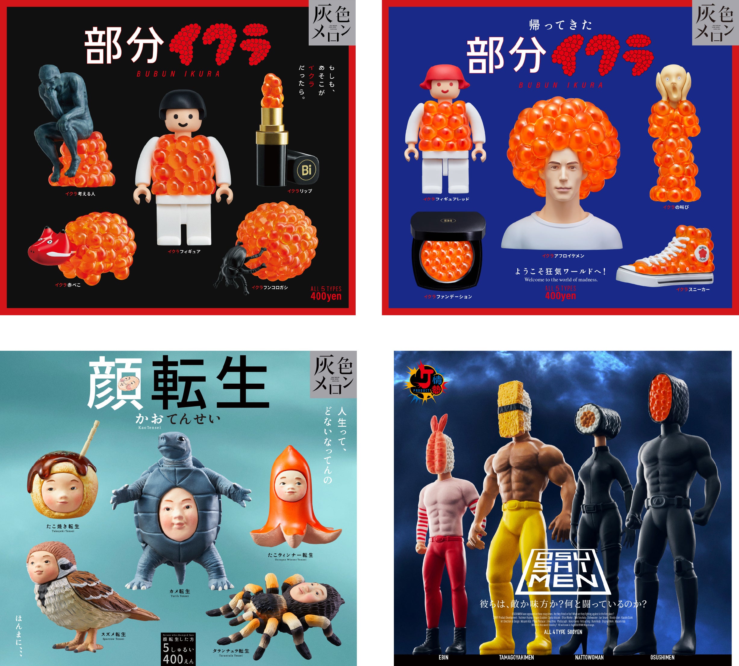 カプセルトイブランドの「灰色メロン」はガチャガチャアーティストの飯田マサミが2024年に立ち上げ、株式会社スタンド・ストーンズからカプセルトイをリリースしています。「本格的にヘン!」をコンセプトに、ヘンなものを真面目に生み出す滑稽さが個性のカプセルトイブランドで、現在9商品をリリースしています。話題作は「部分イクラ」「顔転生」や飯田マサミの個人ブランドからは「OSUSHIMEN(オスシメン)」などがあります。