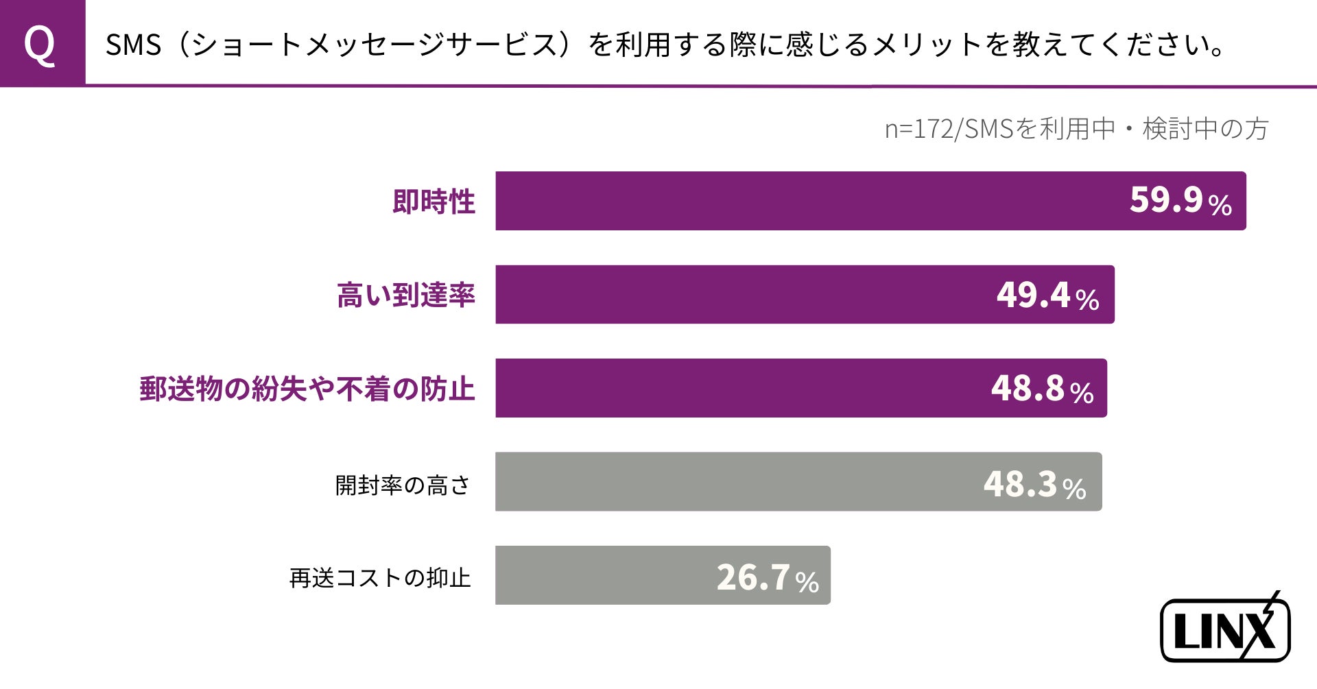 SMS(ショートメッセージサービス)を利用する際に感じるメリットについて尋ねたところ、「即時性」が59.9%で最も多く、「高い到達率」が49.4%、「郵送物の紛失や不着の防止」が48.8%と続きました(n=172/SMSを利用中・検討中の方)。