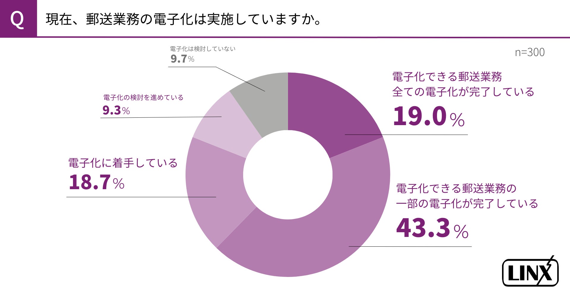 現在、郵送業務の電子化を実施しているか尋ねたところ、全ての電子化が完了している企業は19.0%、一部の電子化が完了している企業は43.3%、電子化に着手している企業は18.7%でした。9.7%の企業は、電子化を検討していないと回答しました(n=300)。