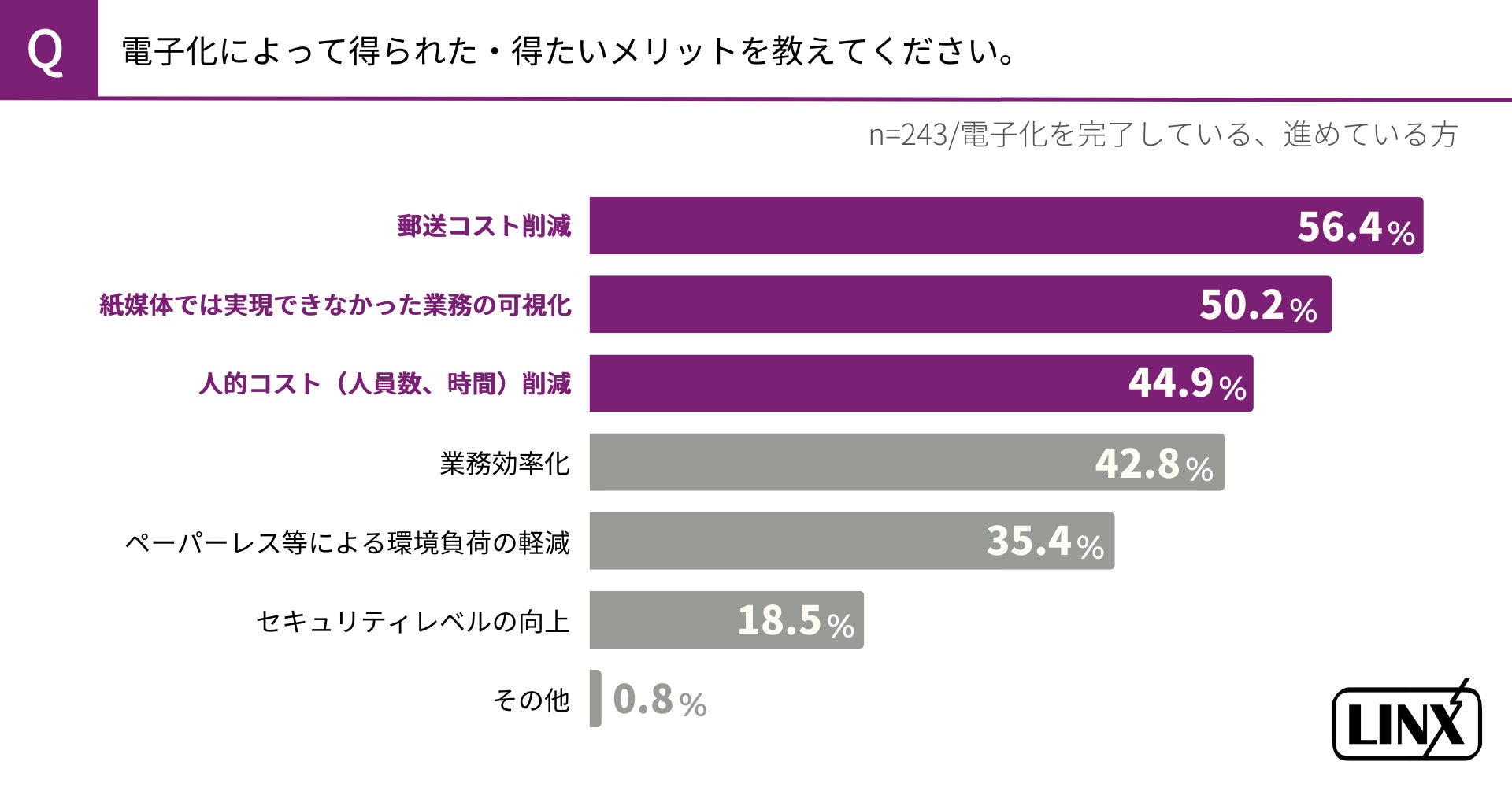 電子化によって得られた、または得たいメリットを尋ねたところ、「郵送コスト削減」が56.4%で最も多く、「紙媒体では実現できなかった業務の可視化」が50.2%、「人的コスト(人員数、時間)削減」が44.9%と続きました(n=243/電子化を完了している、進めている方)。
