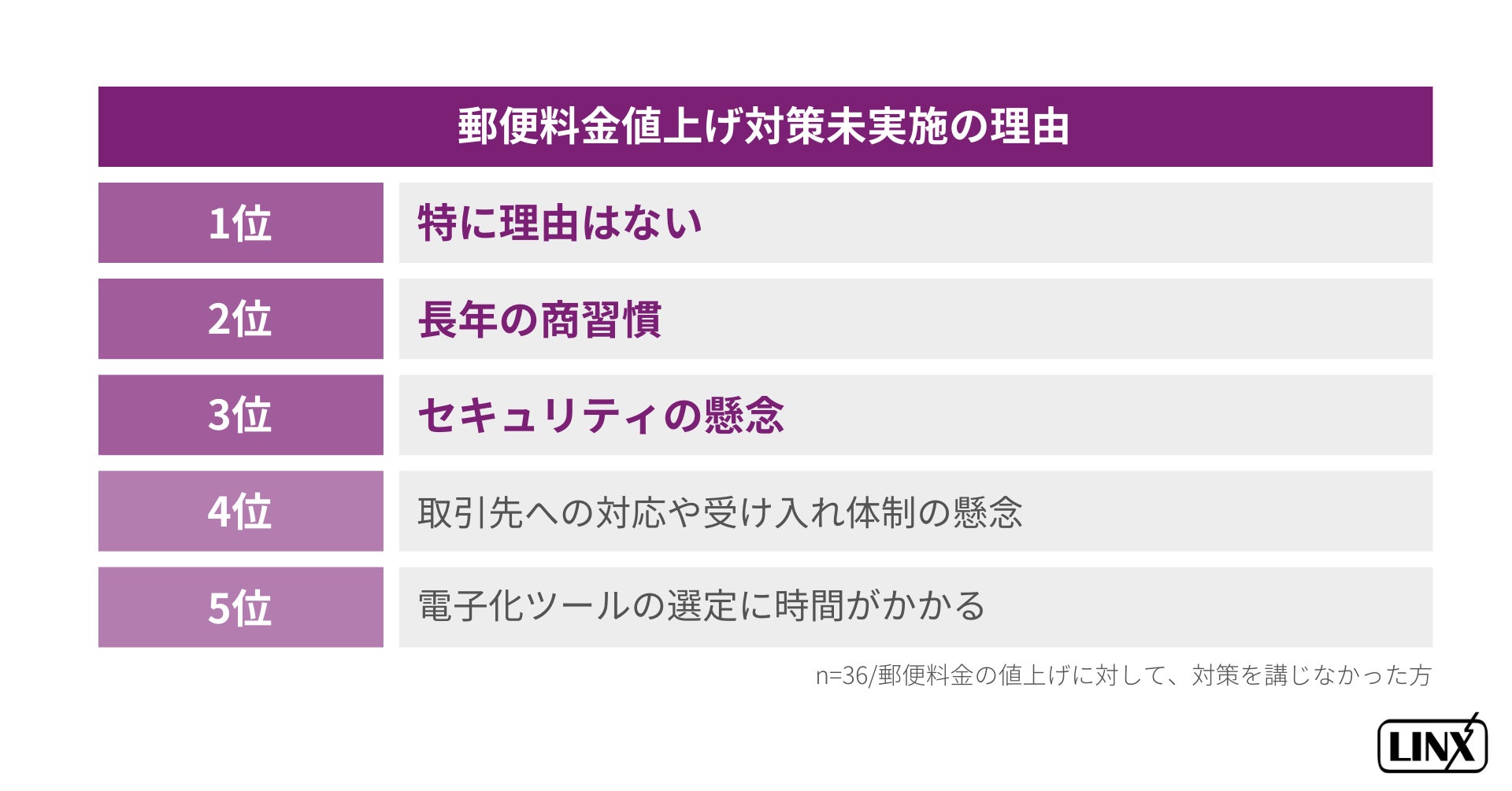 郵便料金の値上げに対して、対策を講じなかった理由を尋ねたところ、1位「特に理由はない」と検討が進まない様子が伺える結果となりました。続いて2位「長年の商習慣」3位「セキュリティの懸念」となりました(n=36/郵便料金の値上げに対して、対策を講じなかった方)。