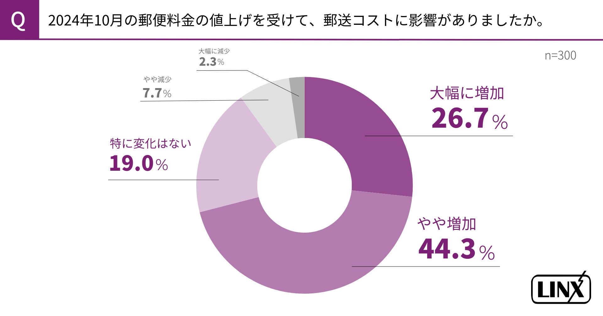 2024年10月の郵便料金の値上げを受けて、郵送コストに影響があったか尋ねたところ、「大幅に増加」が26.7%、「やや増加」が44.3%で、合わせて約7割の企業が「増加した」と回答しました。(n=300)。