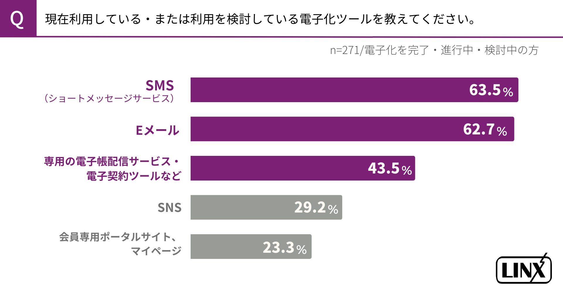 現在利用している、または利用を検討している電子化ツールを尋ねたところ、「SMS(ショートメッセージサービス)」が63.5%と最も多く、「Eメール」が62.7%、「専用の電子帳配信サービス・電子契約ツールなど」が43.5%と続きました(n=271/電子化を完了・進行中・検討中の方)。