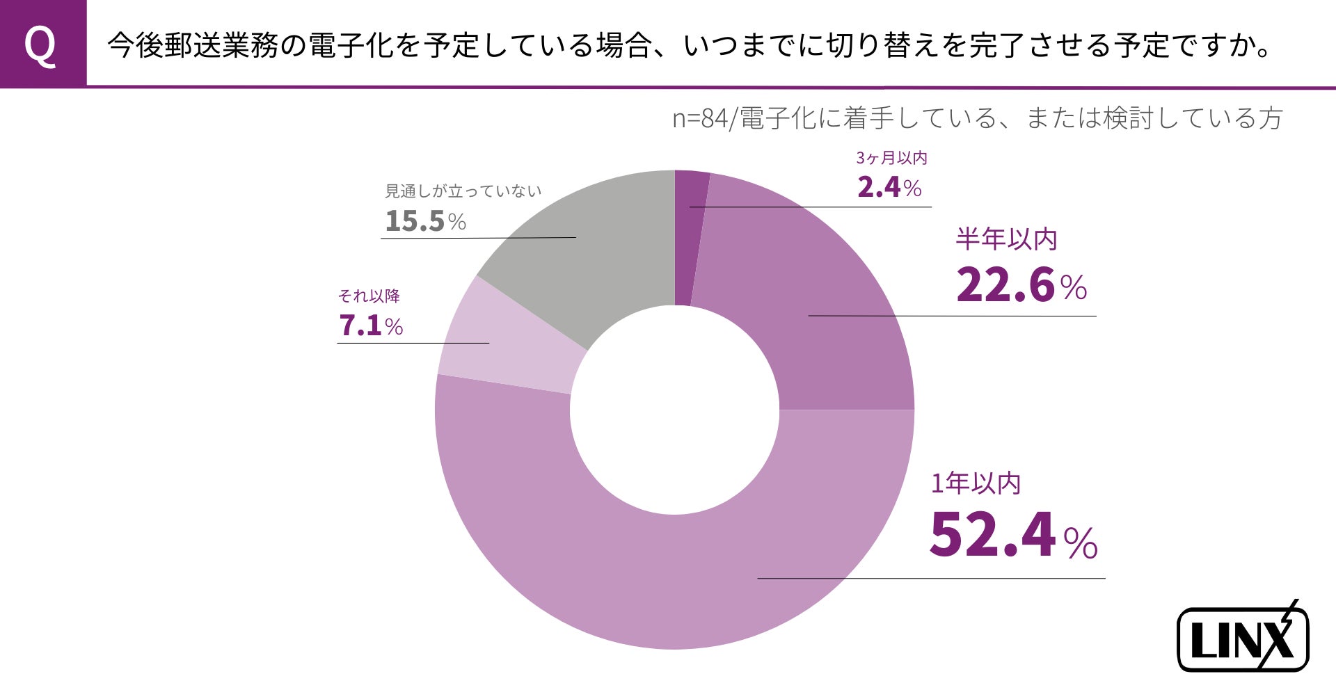 今後郵送業務の電子化を予定している場合、いつまでに切り替えを完了させる予定か尋ねたところ、「1年以内」が52.4%で最も多く、「半年以内」が22.6%、「1年以降」が7.1%と続き、約8割の企業が1年以内に切り替えを検討していることがわかりました。また、15.5%の企業は「見通しが立っていない」と回答しました(n=84/電子化に着手している、または検討している方)。