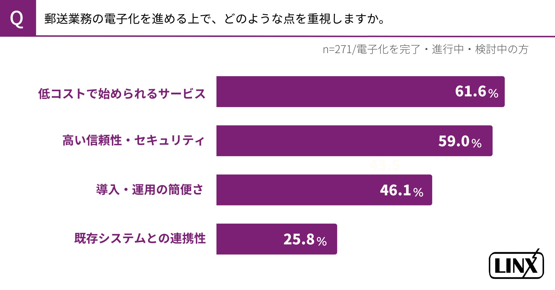 郵送業務の電子化を進める上で、どのような点を重視するか尋ねたところ、「低コストで始められるサービス」が61.6%で最も多く、「高い信頼性・セキュリティ」が59.0%、「導入・運用の簡便さ」が46.1%と続きました(n=271/電子化を完了・進行中・検討中の方)。
