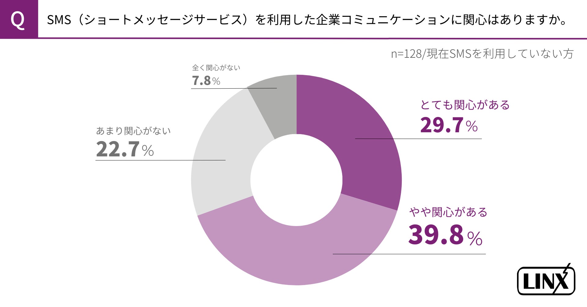現在SMS(ショートメッセージサービス)を利用していない方に、SMSを利用した企業コミュニケーションに関心があるか尋ねたところ、「とても関心がある」が29.7%「やや関心がある」が39.8%で、合わせて約7割が関心があると回答しました(n=128/現在SMSを利用していない方)。