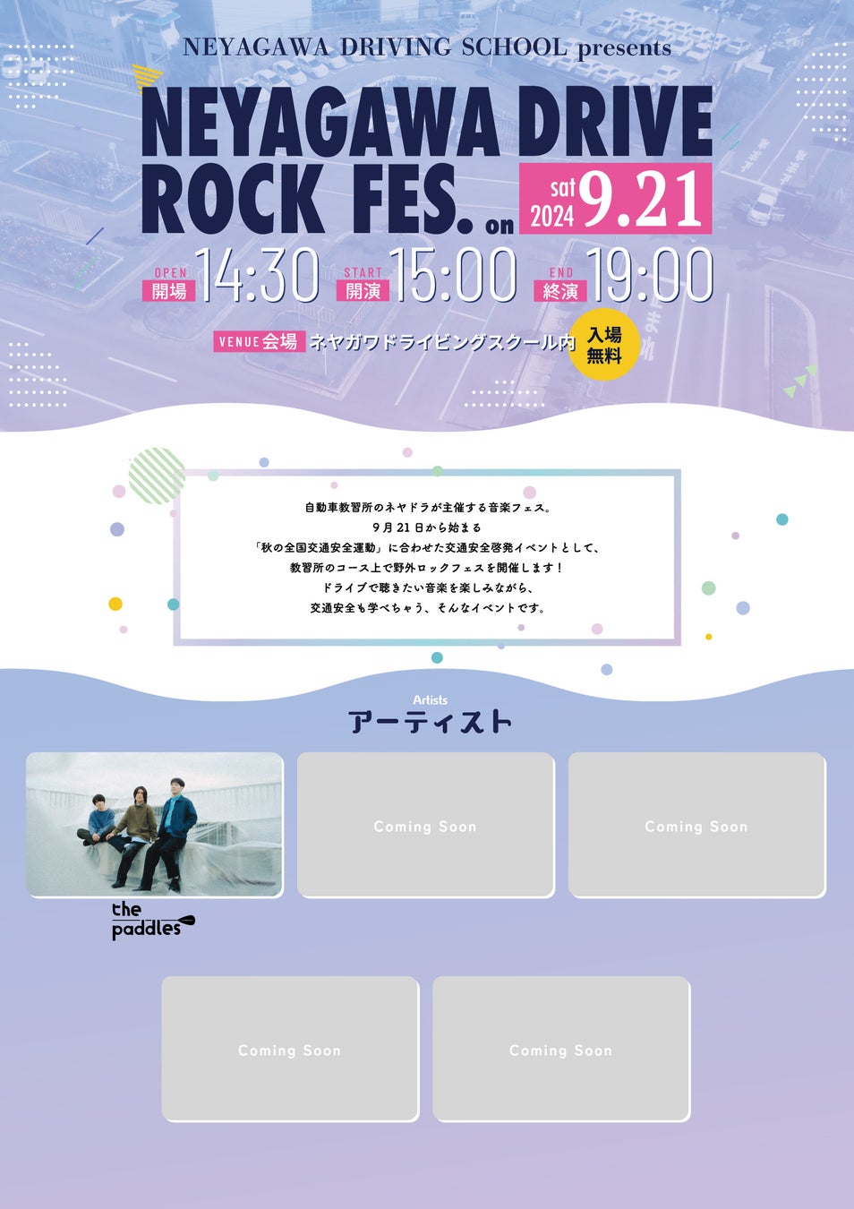 「卒業したくない教習所」をコンセプトに教習所らしからぬ様々な取り組みを行う「ネヤガワドライビングスクール」(通称「ネヤドラ」。大阪府寝屋川市)は、2024年9月21日(土)に教習所内で野外音楽フェス「NEYAGAWA DRIVE ROCK FES.」(寝屋川ドライブロックフェス)を開催いたします。