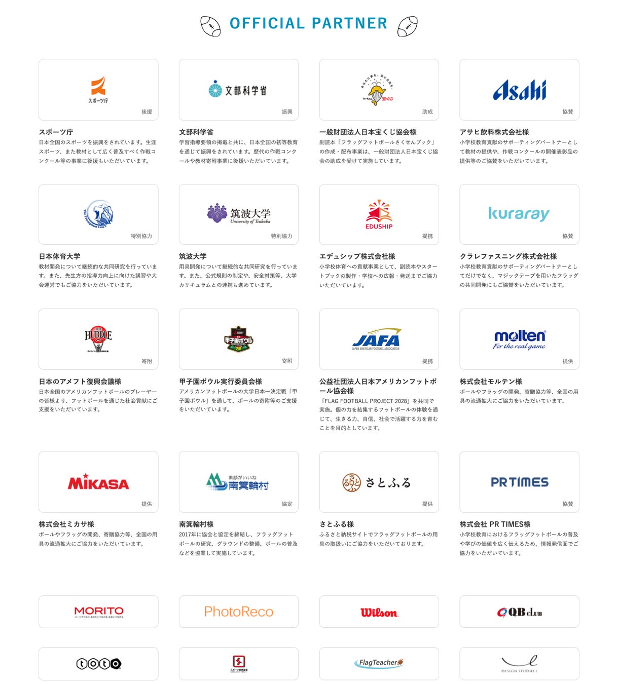サポーティングパートナーの皆様のご支援によって、小学校へのフラッグフットボールの教材の寄贈活動を続けてきました。