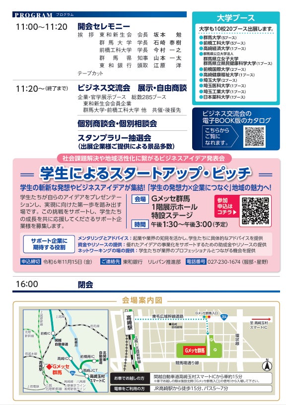 後援 経済産業省 関東経済産業局・群馬県・埼玉県・前橋市・高崎市・渋川市・群馬県産業支援機構・ 埼玉県産業振興公社・埼玉大学・北関東産官学研究会・群馬工業高等専門学校・量子科学技術研究開発機構高崎量子技術基盤研究所・群馬県信用保証協会・埼玉県信用保証協会・群馬県商工会議所連合会・前橋商工会議所・ 高崎商工会議所・上毛新聞社・埼玉新聞社・群馬テレビ