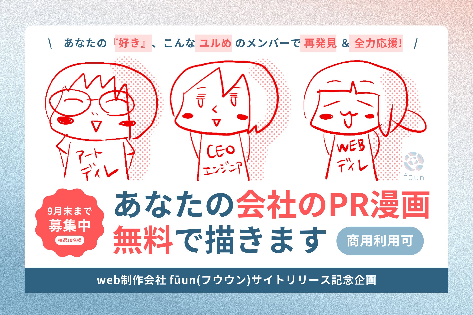 株式会社fūun(東京・新宿/代表 鷲尾和子、以下fūun)は、コーポレートサイト公開記念企画として、8月1日(木)より『あなたの会社のPR漫画、無料で描きますキャンペーン』を実施いたします。
