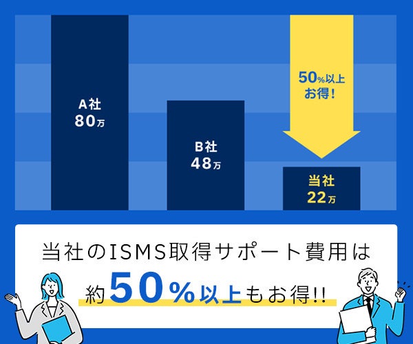 ISMS取得支援サポート費用22万円~(税別)のわかりやすい料金体系で、認証取得に要した期間にかかわらず初回見積もりの料金でISMS取得を目指せます。