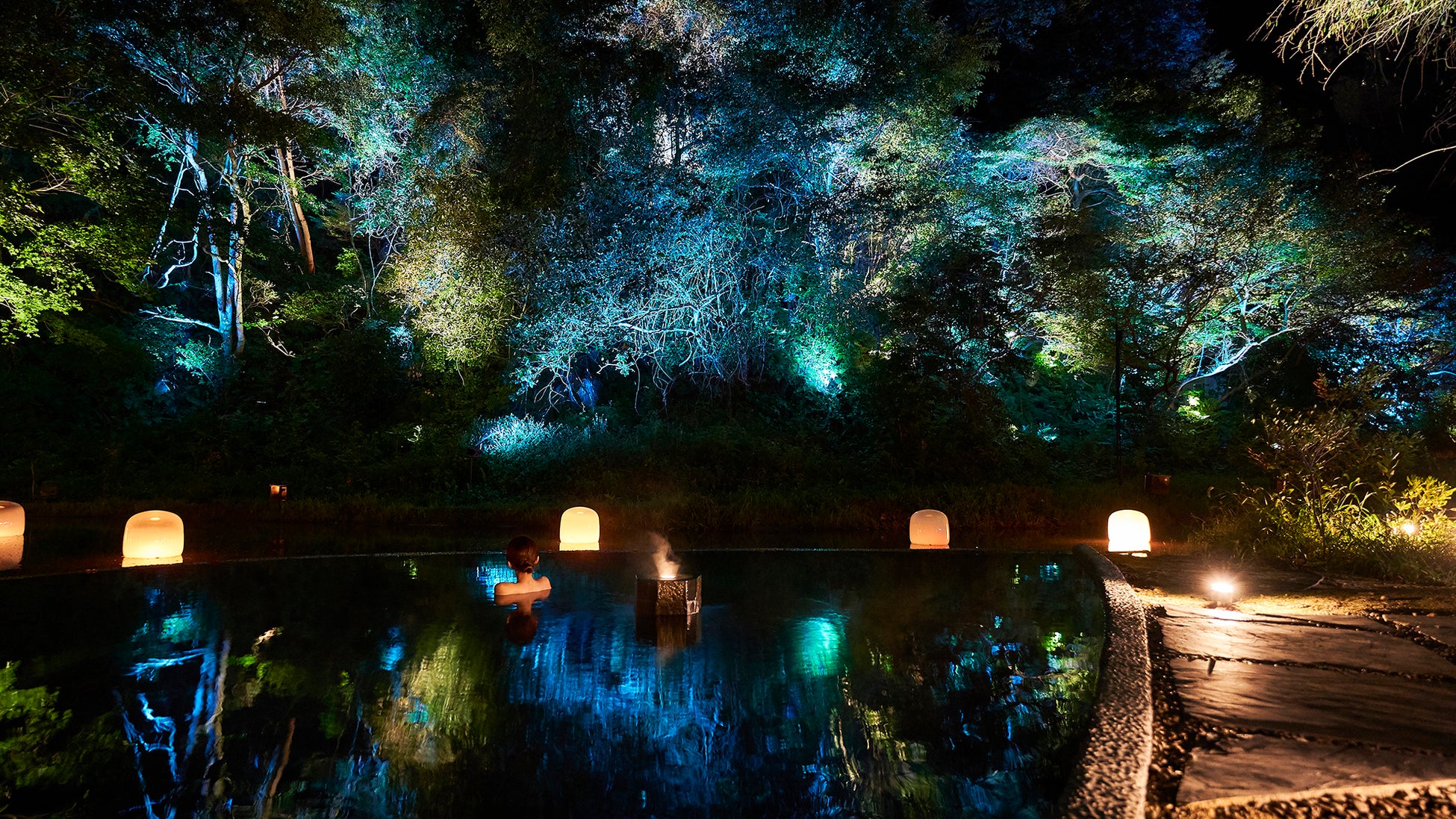 湯には内湯と外湯があり、内湯は男女別の温泉で、外湯は水着で入る男女共通の温泉です。棚田跡と一体の温泉は、夜には隠田跡にランプが浮かぶチームラボの作品と一体となります。
