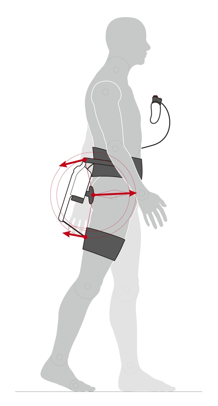 理学療法士が脳卒中片まひ者へ行う介助を再現する着るロボットと、リハビリテーションの実施、管理を行うロボットシステムを開発します。このロボットシステムは、着脱が容易で、歩行リハビリテーションにおいて重要なポイントの一つである股関節への適切な介入をボタン一つで実現し、立脚期の正しい姿勢を維持しつつ股関節の伸展を促進します。これにより、理学療法士の介助の再現性を担保しつつ、リハビリテーションの実施状況、ロボットから得られるセンサデータを定量的に分析、記録、管理することで理学療法士の技術の蓄積及び歩行リハビリテーション全体の質の向上にもつなげます。