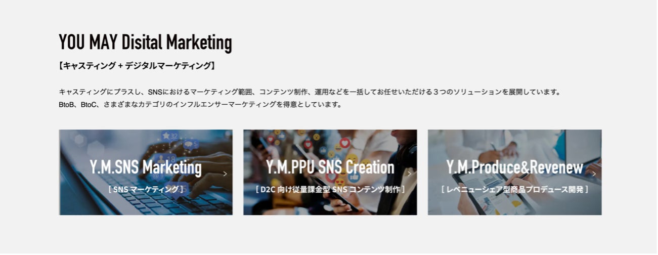 キャスティングにプラスし、SNSにおけるマーケティング範囲、コンテンツ制作、運用などを一括してお任せいただける3つのソリューションを展開しています。BtoB、BtoC、さまざまなカテゴリのインフルエンサーマーケティングを得意としています。