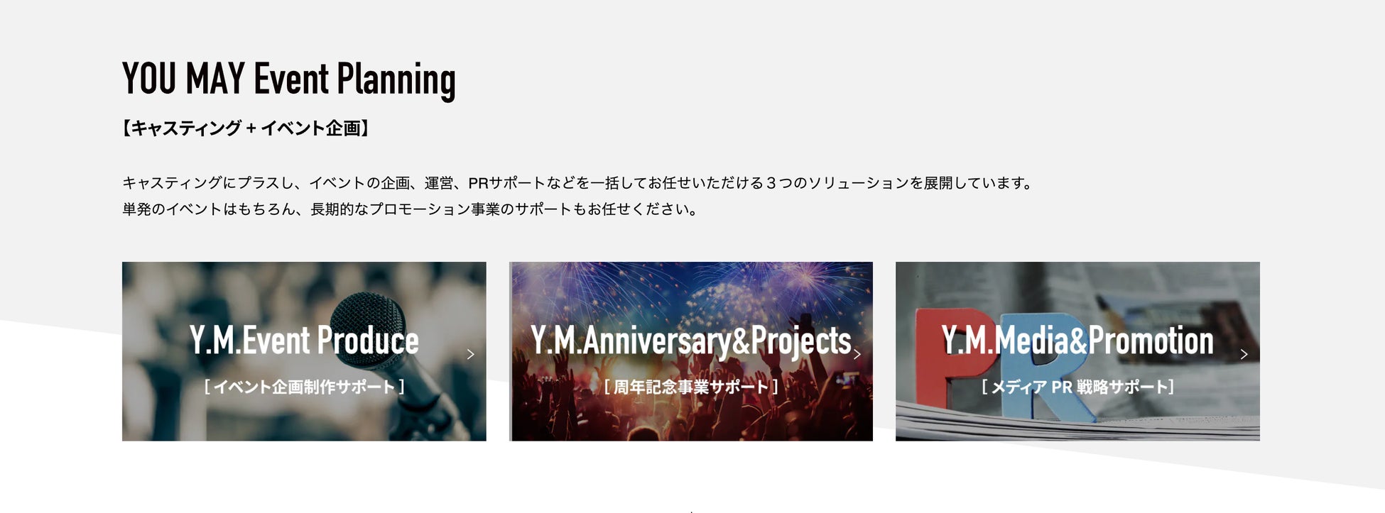 事業内容:キャスティング事業(YOU MAY Casting/aModel commune)、制作事業、発掘・育成・支援事業(AZUKARI/モデルインストラクター協会/p.m.design)、タレントエージェント事業、スタジオ事業