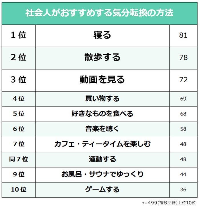 外出するものからインドア系まで、さまざまな回答がランクインしています。「職場ならコーヒーを淹れる」「休日は買い物に行く」など、シチュエーションによって気分転換の方法を使い分けている人も多いのではないでしょうか。