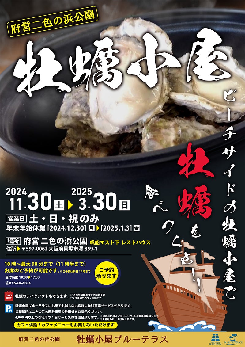 府営二色の浜公園BLUE PARK(店舗運営者:株式会社二色の浜PX)は府営二色の浜公園の帆船マスト下レストハウスにて期間限定の牡蠣小屋をオープン致します。