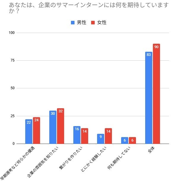2024年に弊社が行った26卒向けのアンケート「26卒のサマーインターン秋冬インターンの参加率について」の中の【インターンシップに何を求めますか?】という質問で一番多かった回答が「企業の職場の雰囲気や業務内容を知ること」だったので、学生がサマーインターンに求める事はここ2年間は変わらず“企業の雰囲気など理解度を高めたい”という事になります。