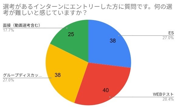 続いて同率の27%で「ES(エントリーシート)」と「グループディスカッション」。一番少なかったのが17.7%で「面接(動画選考含む)」という結果になりました。