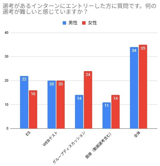 一般的に選考の順番としてはES→WEBテスト→グループディスカッション(行わない企業が多い)→面接という流れになるので、ESやWEBテストで落とされてしまう学生も居た事を考えると、「グループディスカッション」を難しいと感じた学生の比率が高いように思えます。