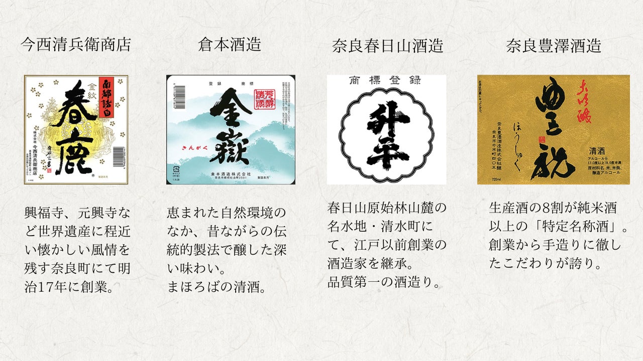 今西清兵衛商店、倉本酒造、奈良春日山酒造、奈良豊澤酒造、株式会社泉屋 (順不同) |