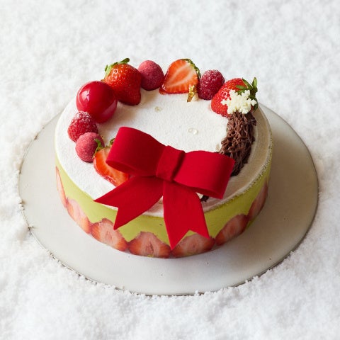 スパイスが優しく香るホワイトチョコレートのムースの中には、カシスのジュレやバニラのクリームブリュレが閉じ込められ、トップにはバニラのガナッシュを華やかにあしらいました。優しいカラーパレットで見た目にも可愛らしいクリスマスリースのようなケーキを、大切な人へのサプライズに。