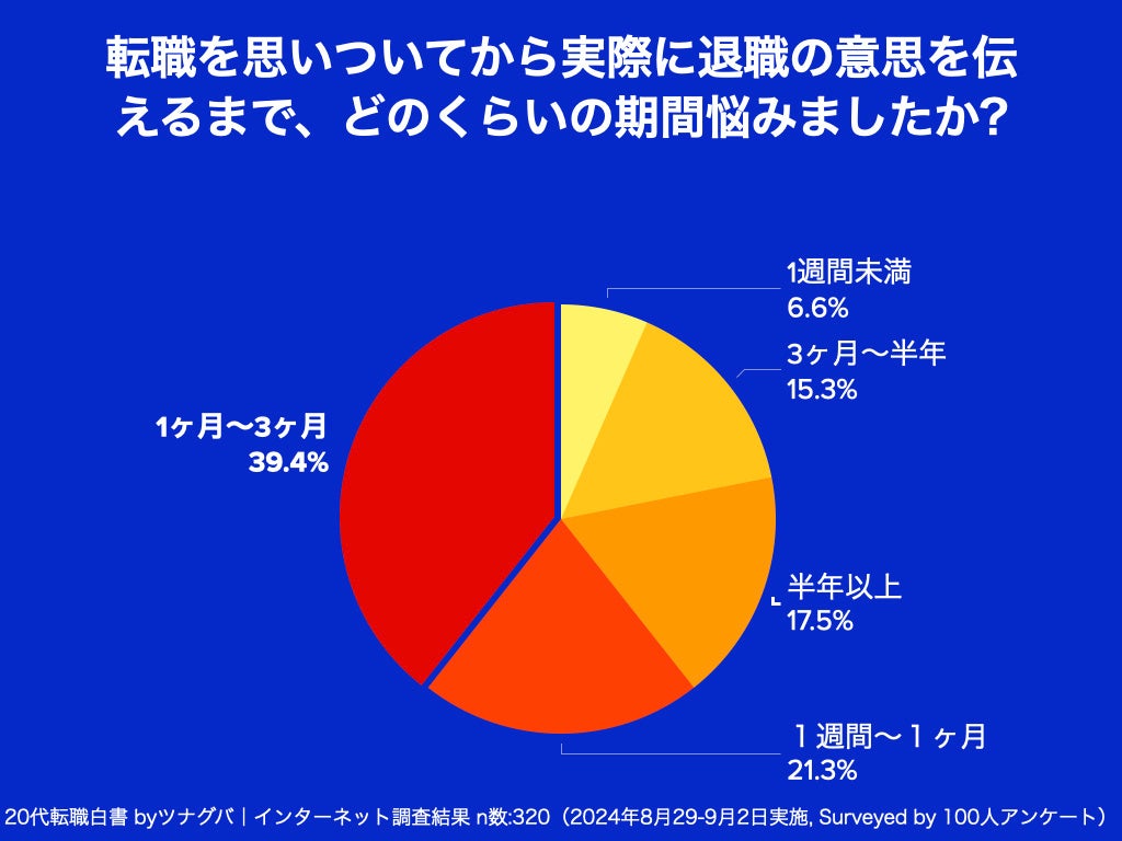 株式会社ツナグバ(所在地:東京都千代田区、代表取締役社長:仲村正俊、以下ツナグバ)は、2024年8月29日から9月2日にかけてインターネットを通じて実施した「20代転職白書 by ツナグバ」の調査結果を発表しました。本調査には320名(男性:96名、女性:224名)が参加し、退職を決意するまでの期間や、退職理由、退職方法に関する実態について調査しました。