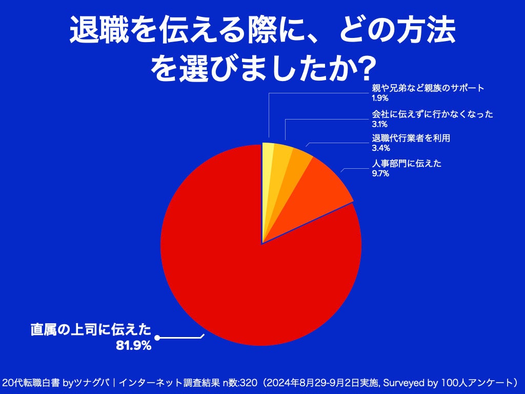 これらの結果から、多くの退職者が比較的従来の方法で退職を申し出ていることがわかりますが、少数ながら退職代行業者を利用するケースも見られることが示されています。