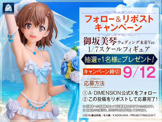 株式会社A・DIMENSION(Aディメンション)(本社:東京都台東区、代表取締役社長:上村篤)は、『とある科学の超電磁砲T 御坂美琴 ウェディング水着Ver. 1/7スケールフィギュア』の発売を決定し、予約受付を2025年7月4日(金)21:00より開始いたします。予約締切は、2025年9月12日(金)23:59となります。