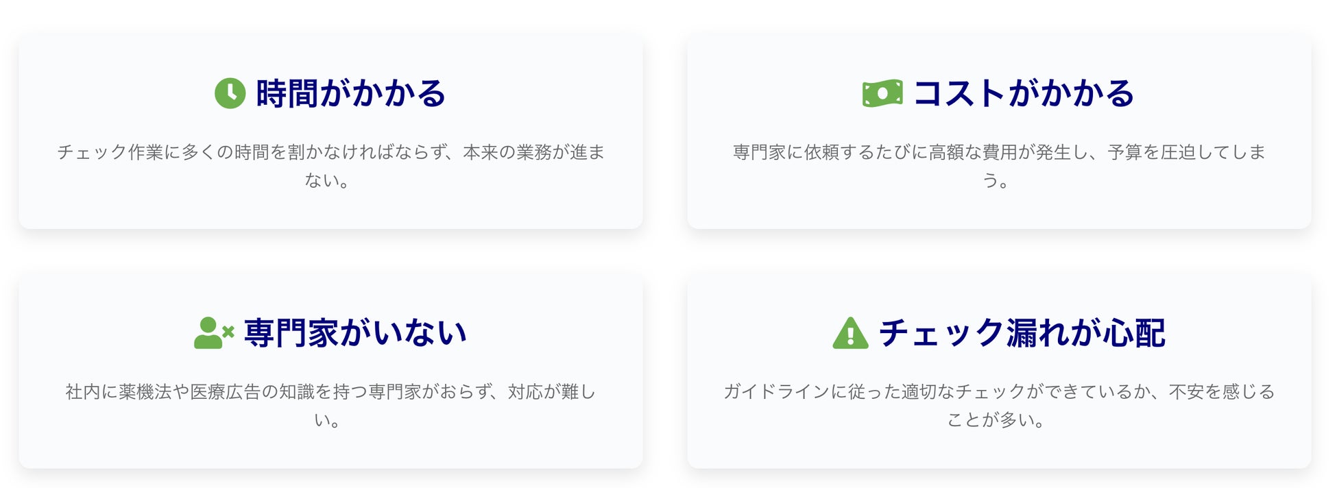 薬機法や医療広告ガイドラインは非常に細かく規定されており、すべての内容が基準に合致しているかを確認するには多くの時間を要します。特に医療関連の内容では、法律やガイドラインの変動も考慮する必要があり、チェック作業は非常に煩雑です。