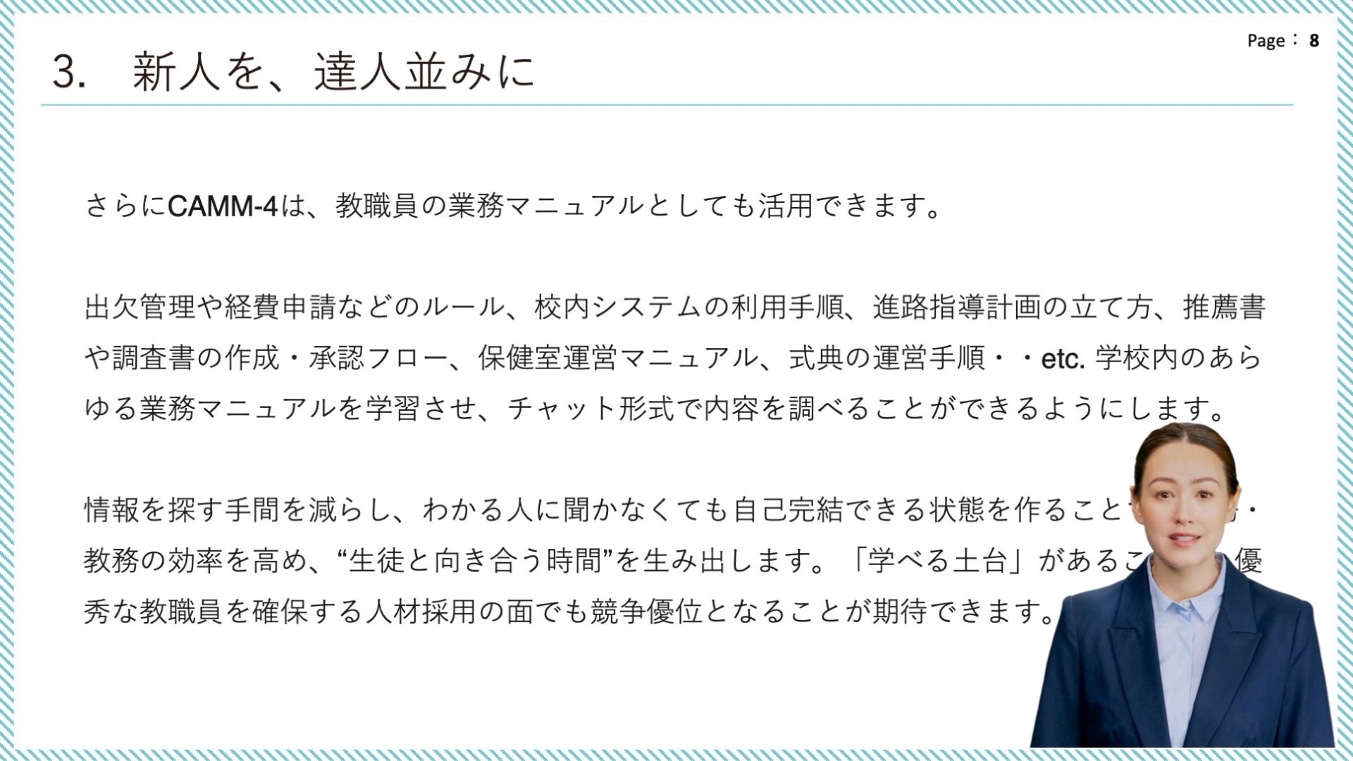 ジナル生成AI構築システム『CAMM-4(キャム・フォー)』を活用することで、「1.教職員の