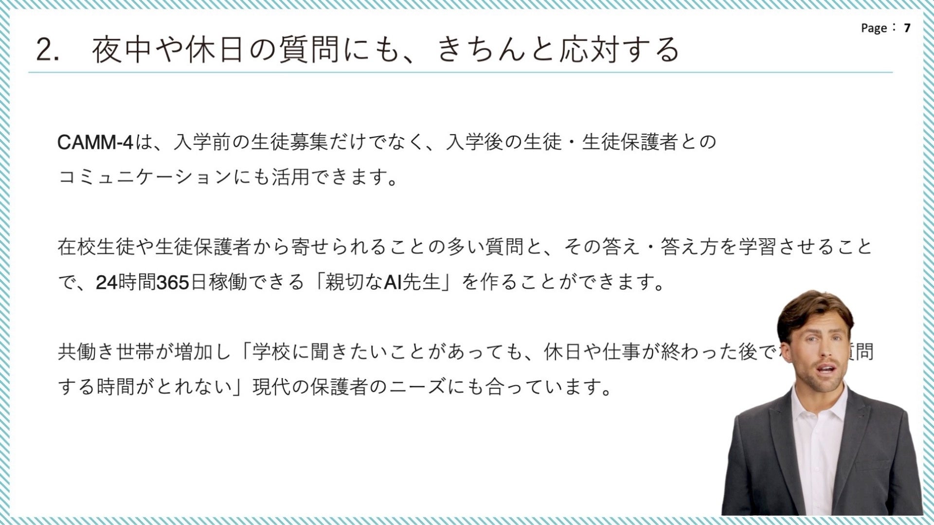 また、CAMM-4は入学前の生徒募集だけでなく、入学後の生徒・生徒保護者とのコミュニケーションでも大変役に立つツールです。在校生徒や生徒保護者から寄せられることの多い質問と、その答え・答え方を学習させることで、24時間365日質問に応対できる「親切なAI先生」を作ることができます。共働き世帯が増加し「学校に聞きたいことがあっても、休日や仕事が終わった後でないと質問する時間がとれない」現代の保護者のニーズにも合っています。