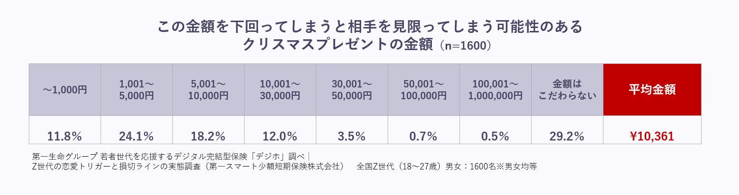 さらに、全体を対象に相手に求めるクリスマスプレゼントについて『この金額を下回ってしまうと相手を見限るライン』を伺ったところ、平均「10,361円」との回答が集まりました。恋人や意中の人へクリスマスプレゼントを選ぶ際に、予算がおおよそ1万円を下回ってしまうと相手が幻滅する可能性があることが分かった一方で、29.2%が「金額はこだわらない」と回答もあり、Z世代の約3人に1人はプレゼント金額を重視していないことが確認できました。