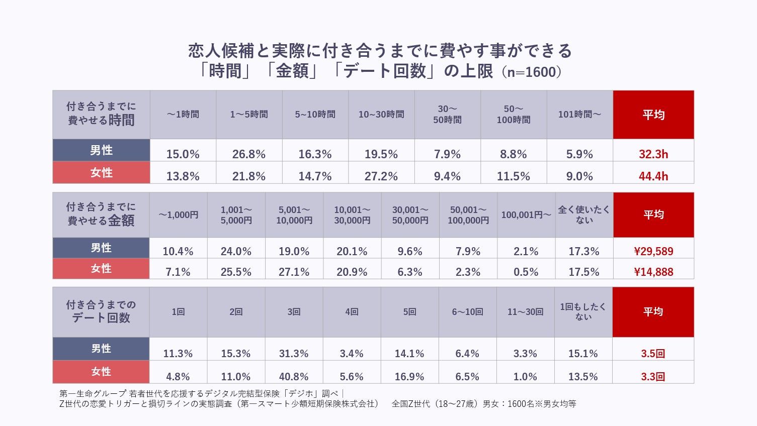 パートナー候補に費やせる金額の上限は男性約3万/女性約1.5万と、恋の損切ライン※も明らかに。