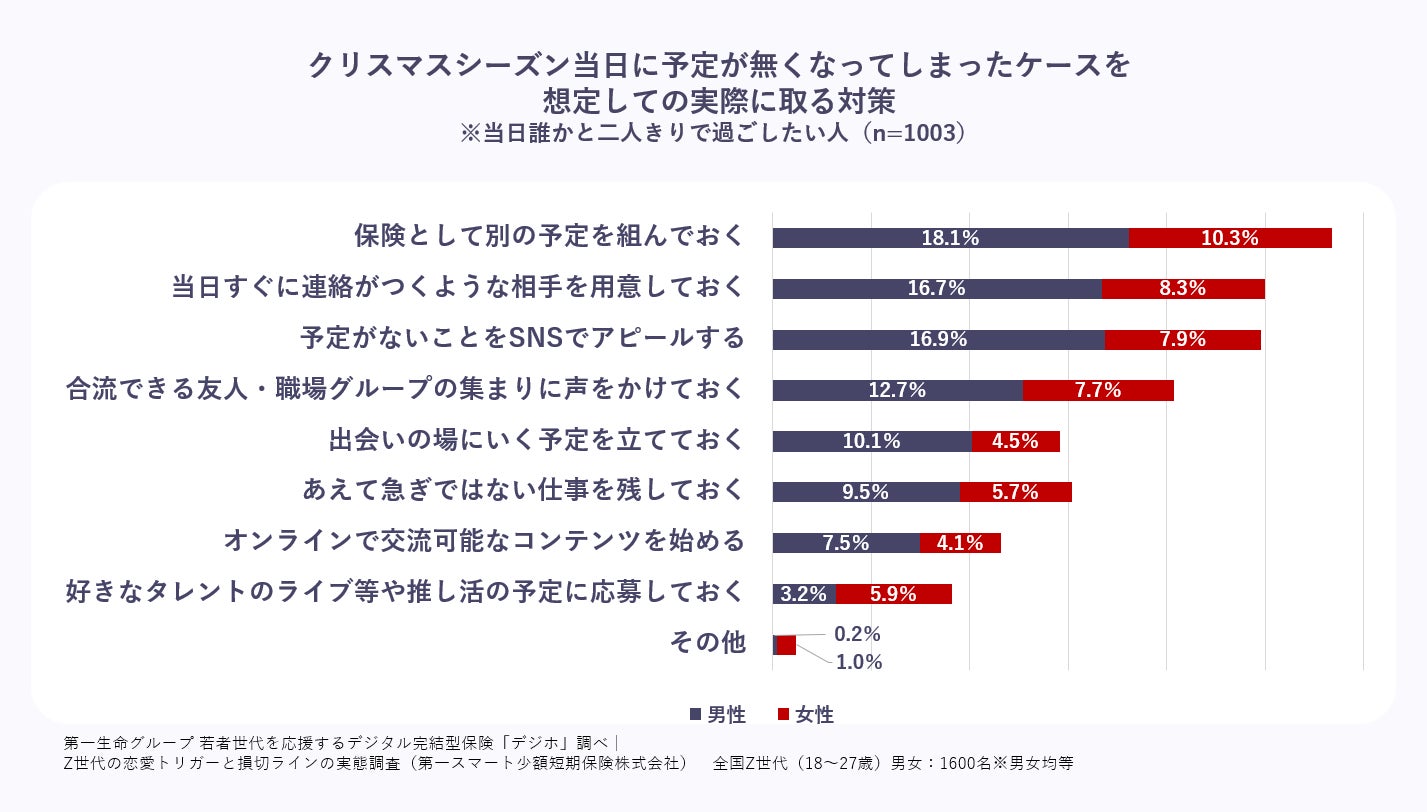 なお、『当日、予定が無くなった際の対策』では、「保険として別の予定も組む(男性:18.1%/女性:10.3%)」、「当日すぐ連絡がつく相手を用意(男性:16.7%/女性:8.3%)」、「予定が無い事をSNSでアピール(男性:16.9%/女性:7.9%)」が上位となり、いずれも男性の方が何かしらの対策を講じている傾向にあることが分かりました。