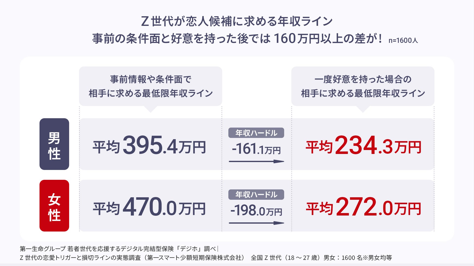 ③【Z世代の恋愛“損切りライン”】相手に好意を持つと、求める年収ハードルが160万円ダウン⁉